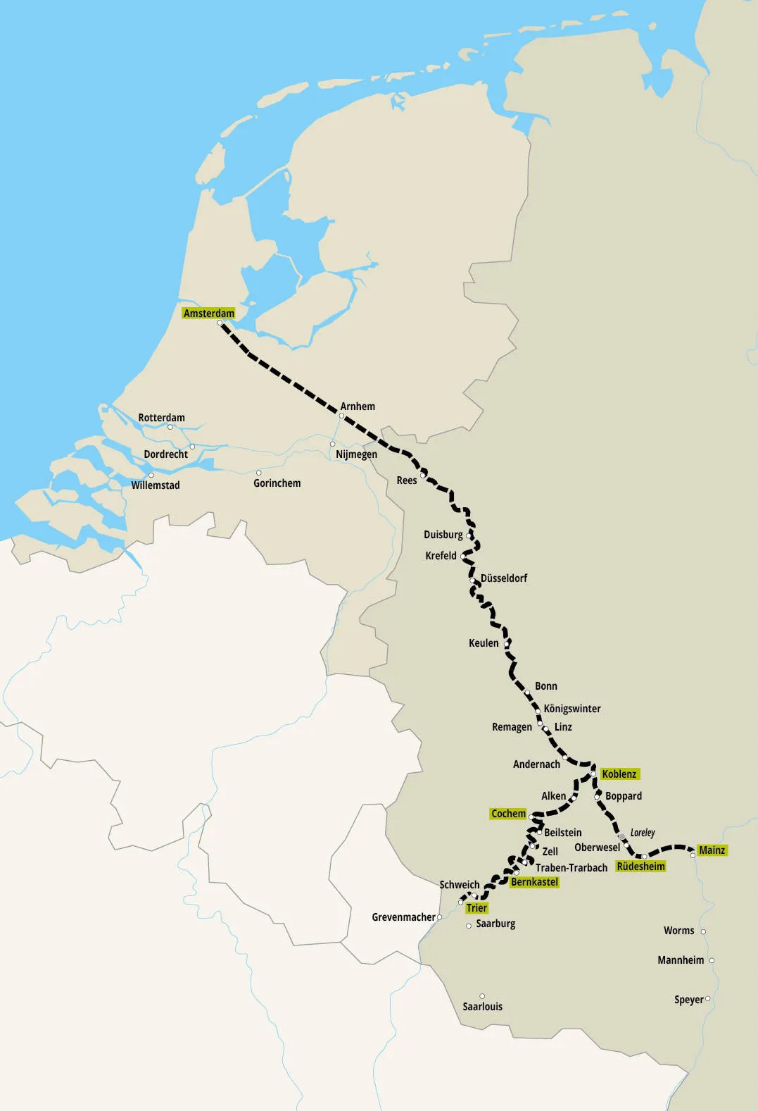 Vaar over de betoverende Moezel aan boord van een luxueus schip en ontdek een van de mooiste verborgen parels van Europa. Deze unieke regio staat bekend om zijn weelderige wijngaarden waar de wereldberoemde Riesling wordt geproduceerd, omringd door een prachtig decor van historische kastelen en schilderachtige dorpjes. Beleef de rijke cultuur en geschiedenis tijdens een bezoek aan de oudste Riesling-wijnmakerij ter wereld in de sfeervolle Rheingau. Verken het Romeinse Trier, ook wel het 'Rome van het Noorden' genoemd, met zijn indrukwekkende architectuur. Ontdek de 'Parel van de Moezel', Cochem, met het majestueuze Kaiserburg dat uitkijkt over de adembenemende Moezelvallei. Geniet van de veelzijdigheid van Koblenz, een stad vol historische schatten, en ervaar de lokale Duitse levensstijl in een traditionele biertuin. Dit onvergetelijke avontuur biedt een perfecte combinatie van luxe, natuur, cultuur en culinaire hoogstandjes, geschikt voor elke reiziger.